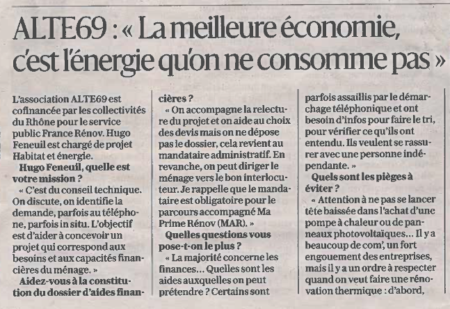 - Le Patriote : ALTE 69, un accompagnement dédié face à la hausse des prix de l’énergie